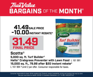 Scotts® 5,000 sq. ft. Turf Builder® Halts® Crabgrass Preventer with Lawn Food Savings ( Print This ) March Bargain Of The Month! Save this month on Scotts® 5,000 sq. ft. Turf Builder® Halts® Crabgrass Preventer with Lawn Food. (L 161 991 *) Limit 2 per offer. Prices valid March 1-31, 2026 while supplies last. Offered By: Western Ohio True Value Hardware